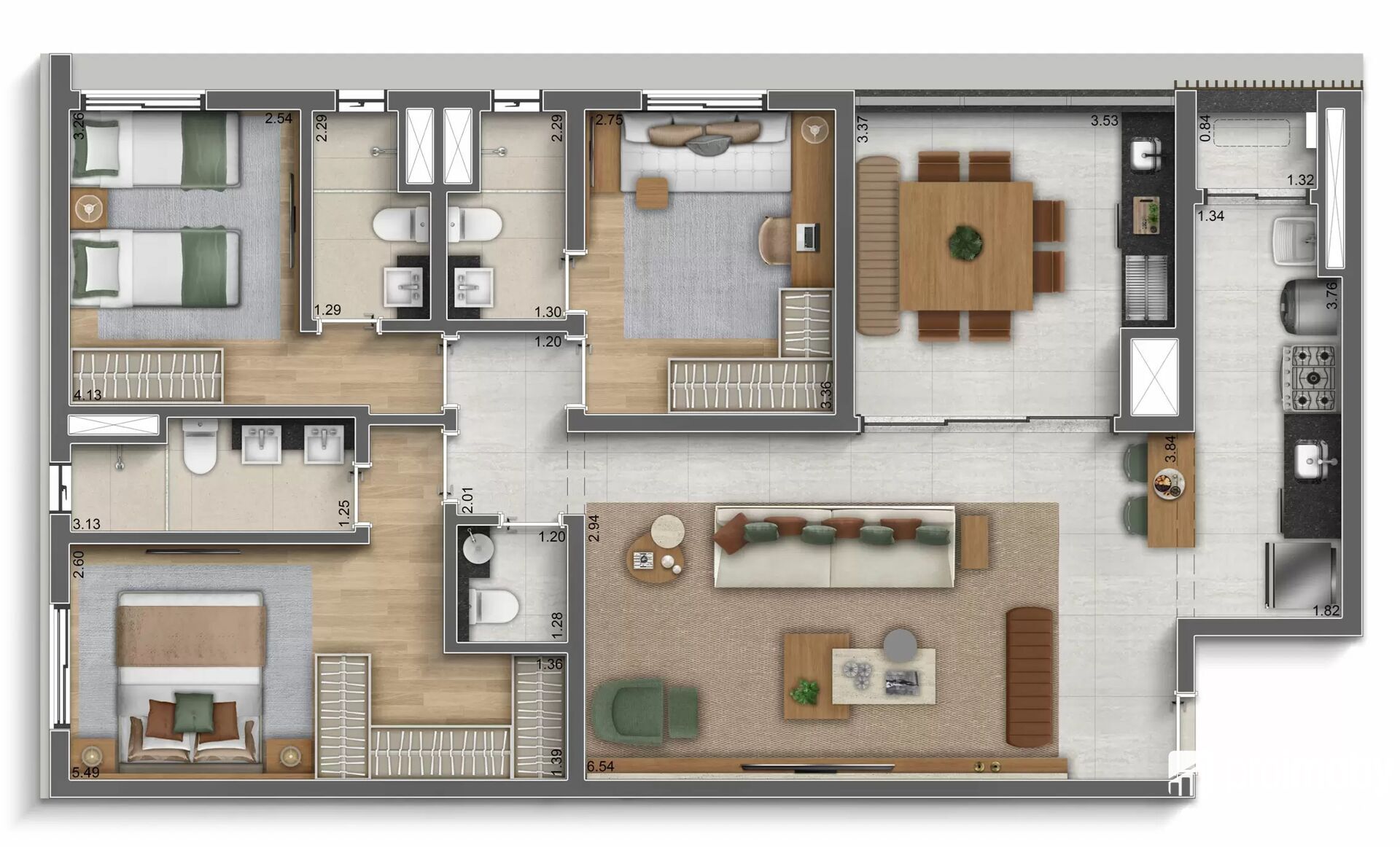 Lazer com piscina adulto e piscina infantil descobertas, piscina adulto coberta, solário, deck molhado, churrasqueira, quadra poliesportiva, jardim, playground, pet place, salão de festas, espaço gourmet, academia, sala de massagem, sauna seca, salão de jogos, brinquedoteca.